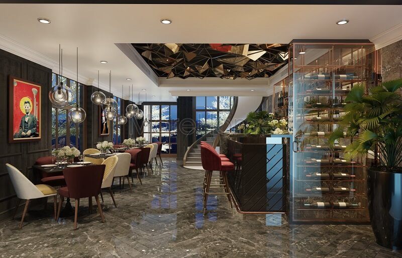 Mẫu thiết kế nhà hàng sang trọng khách sạn 5 sao theo phong cách tân điển Châu Âu với tông màu đỏ trắng chủ đạo