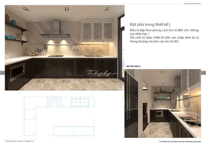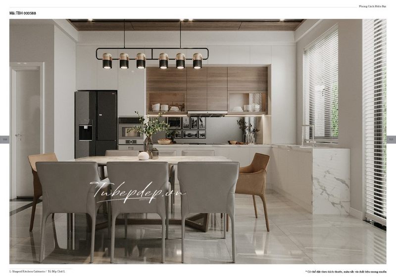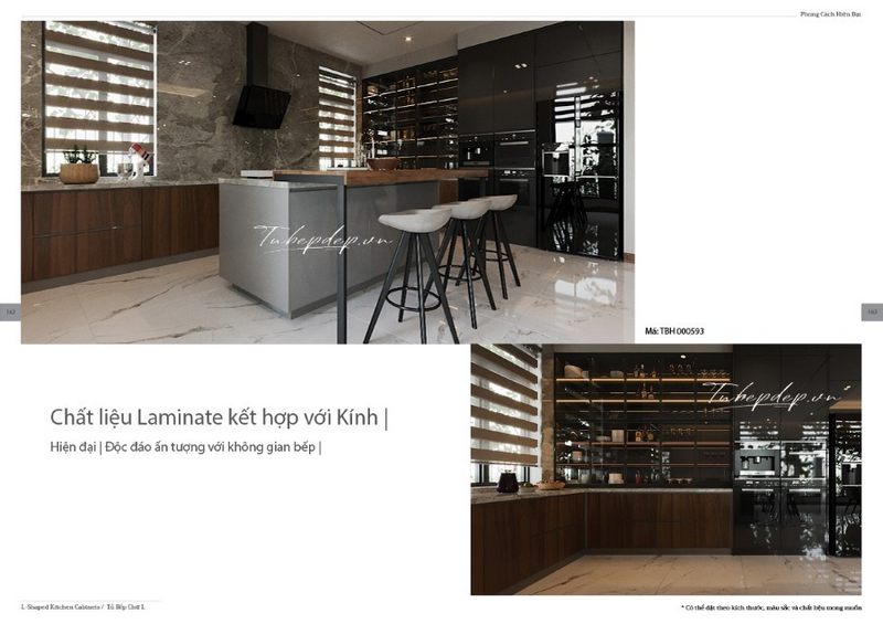 Mẫu tủ bếp mới và độc đáo, trẻ trung được thiết kế để phù hợp với các căn biệt thự, nhà phố hiện đại cung cấp sự tiện nghi và sự sang trọng. Đá ốp bếp được sử dụng rộng rãi trên một phần tường lớn giúp tạo nên một vẻ đẹp bền vững qua thời gian.